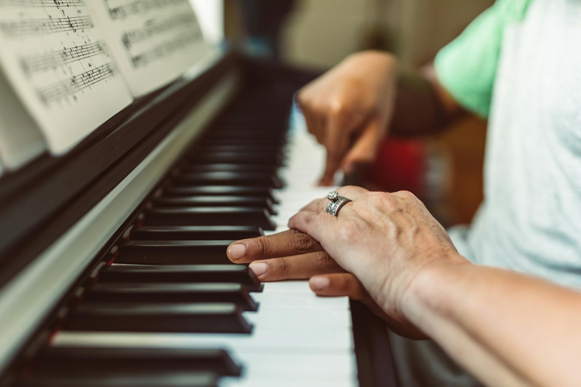 Ojciec uczy syna gry na pianinie w domu